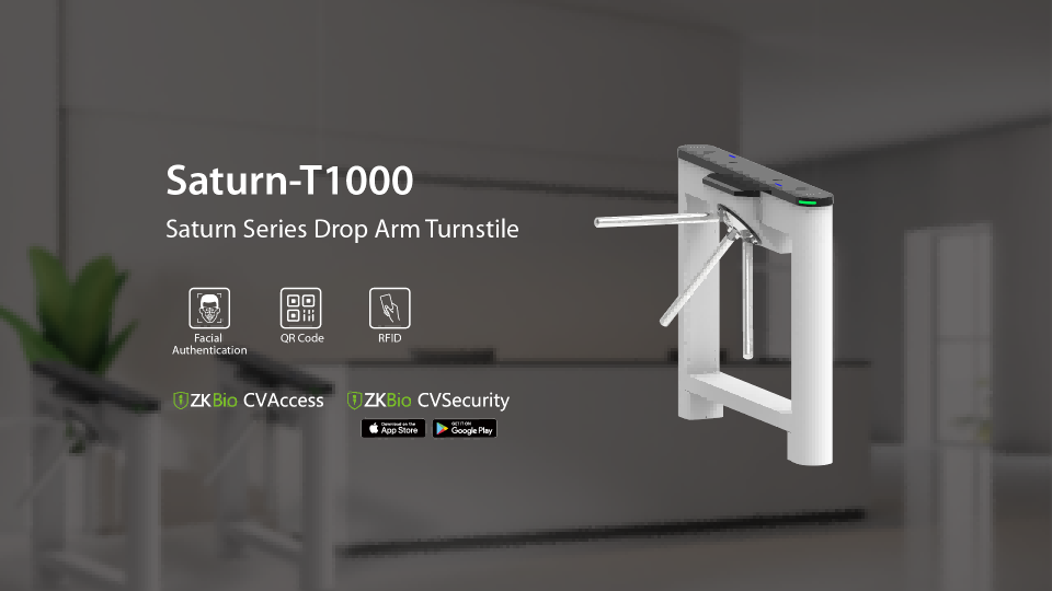 T1000 tripod turnstile has multiple authentication options available, including facial recognition, RFID and QR code (static and dynamic). The Saturn-T1000 seamlessly integrates with the ZKBio CVAccess and ZKBio CVSecurity for comprehensive security management.